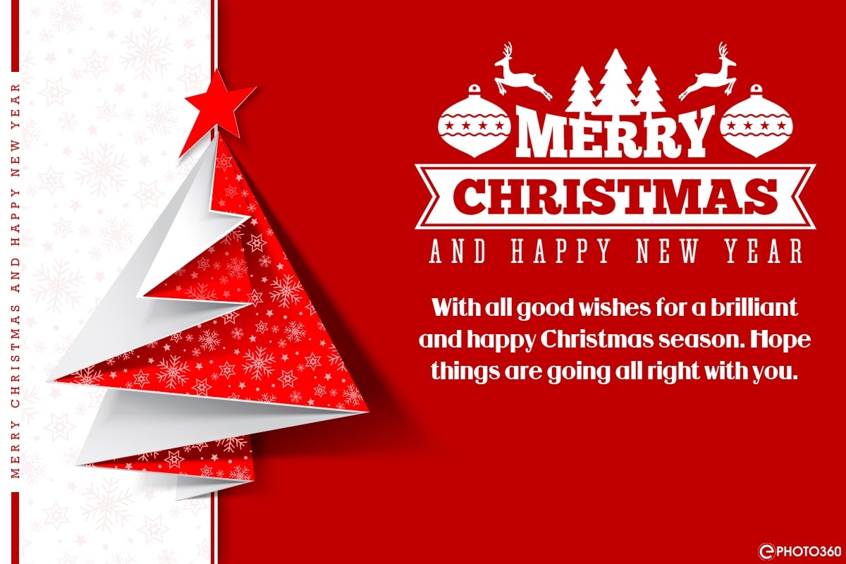 A beautiful Christmas and New Year card design featuring striking red and white tones, highlighted by a modern, stylized Christmas tree. This elegant Christmas card is perfect for sending to friends, family, and colleagues during the festive season. With sharp visuals and a refined layout, it’s ideal for use as an e-card, social media post, or Christmas greeting on websites.