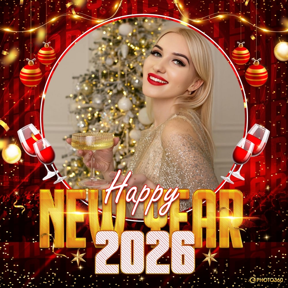 Template of beautiful Happy New Year 2026 photo frames free. If you are looking for a brilliant new Happy New Year 2026 photo collage effect to send Happy New Year greetings to friends and relatives, do not miss this luxurious and polite New Year photo collage and frame design. Easily create and share new year pictures, bringing New Year 2026 atmosphere to your photos.