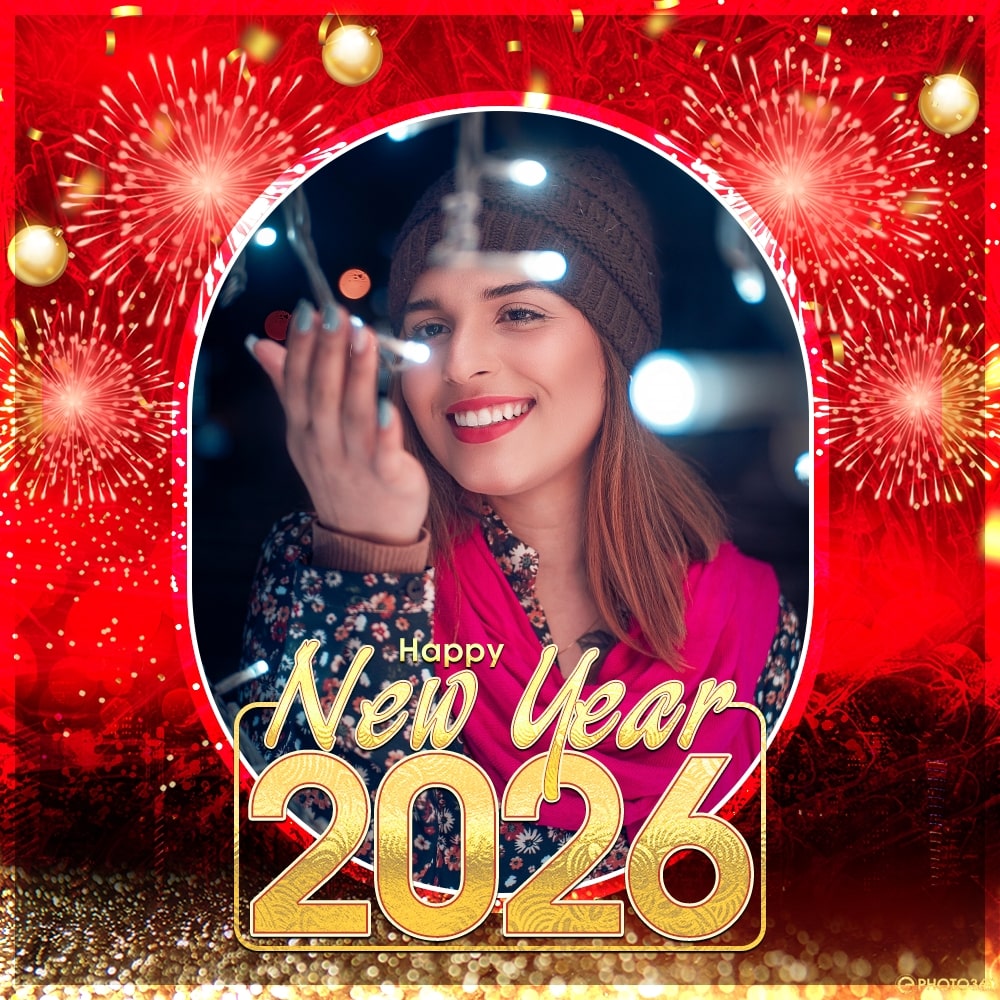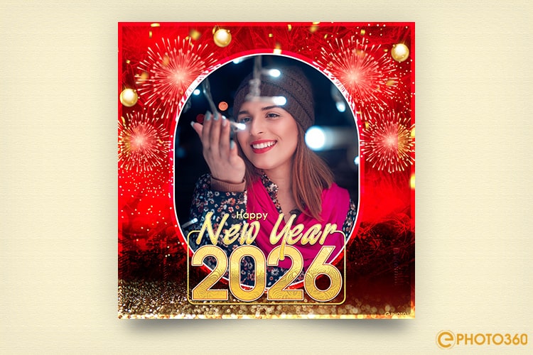 Create happy new year photo frames 2026, new year 2026 frames online with sparkling red background frames with fireworks, it's easy to create new year pictures with photos of yourself or friends, relatives. Send warm and meaningful Happy New Year wishes with the newest Happy New Year 2026 photo frames designed by Ephoto360.